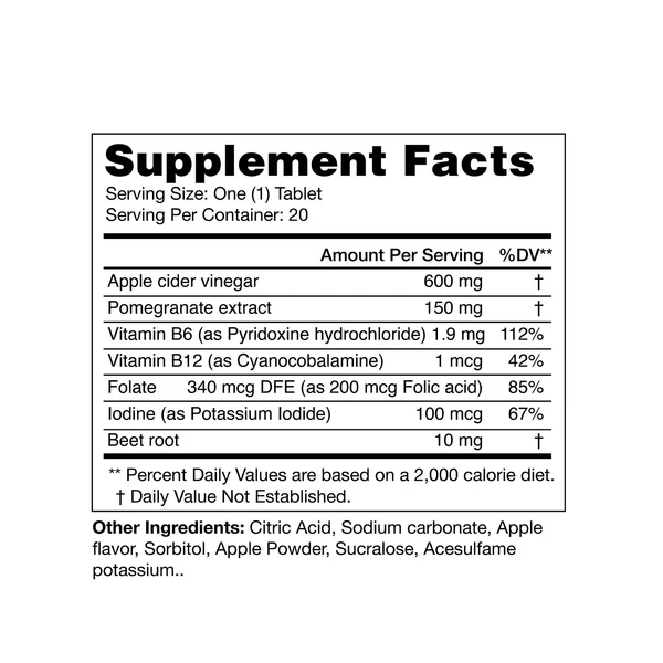 | Ingredients | Apple Cider Vinegar (acetic acid source), Beetroot Extract, Pomegranate Extract, Vitamin B6, Vitamin B12, Folate, Iodine |